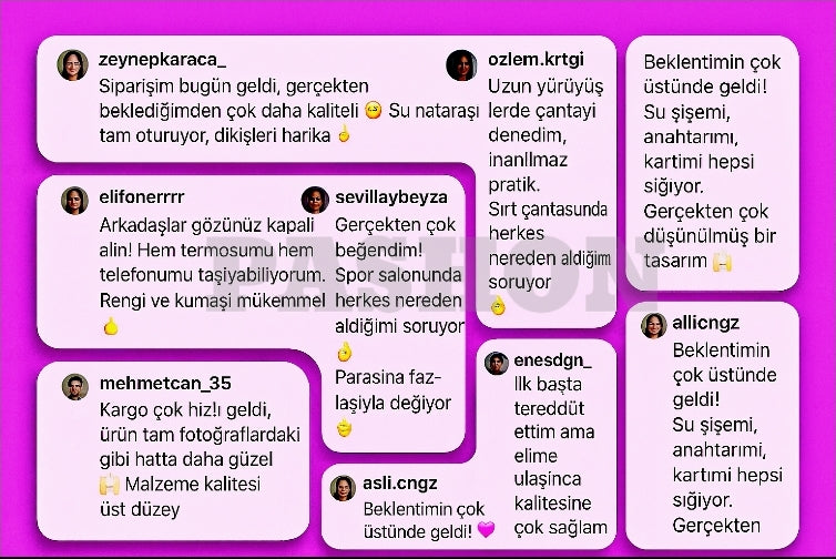 Şu ana kadar çantamızı satın alan binlerce kişiden sadece birkaçını sizlerle paylaşıyoruz.⭐️⭐️⭐️⭐️ 8.000'den fazla mutlu müşteri tarafından 4,8/5 olarak değerlendirildi